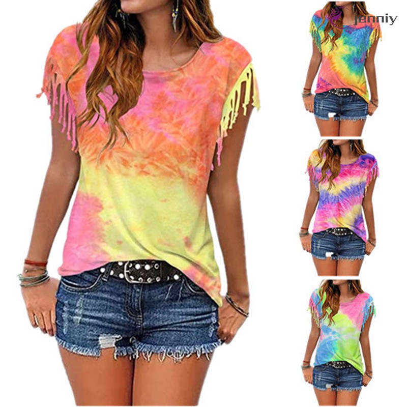 Jny Women Fashion Tie Dye Tassel Short Sleeve T Shirt Top Round Neck Rainbow Colorful T Shirt Shopee Indonesia